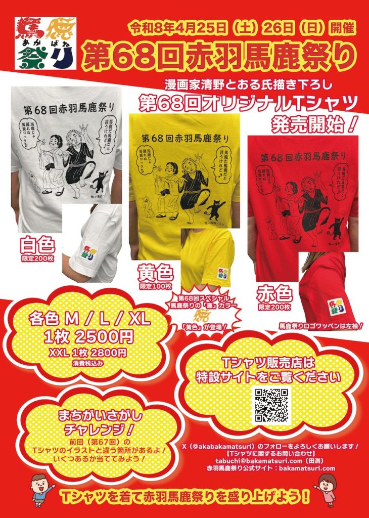 下記馬鹿祭り公式Xにて「#第68回赤羽馬鹿祭りTシャツまちがいさがし」のタグをつけて解答を投稿してみましょう!